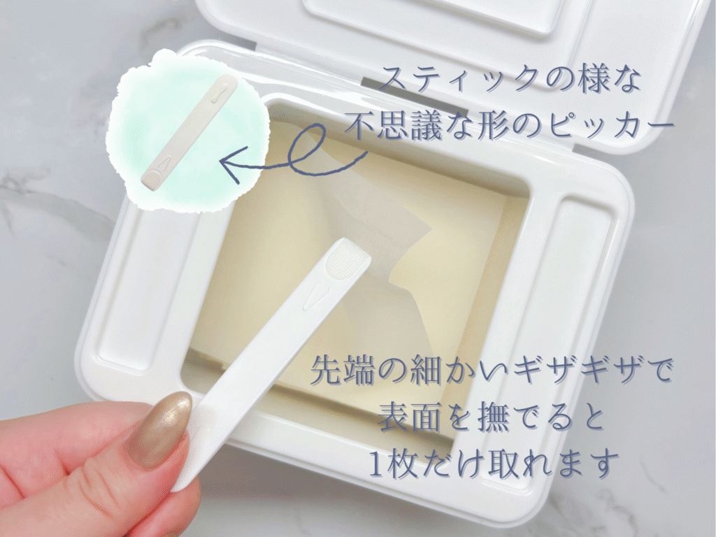 パッドの表面をサッと撫でるだけで1枚ずつスムーズに取り出せるので、複数枚取れてしまう事のあるピンセット型に比べて時間が短縮できました。ベタつきも少なく、すぐに次のスキンケアに移れるのも◎。