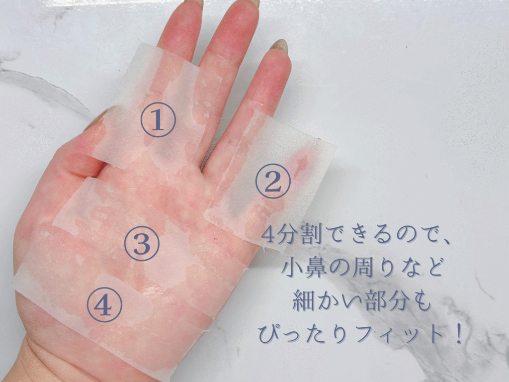 部分的に使えるから、ベースメイクのヨレが気になる部分を重点ケアできるのが便利です。全顔にしっかり貼りたい日は2シート必要ですが、むしろその日の予定に合わせて調整できるのが良かったです。