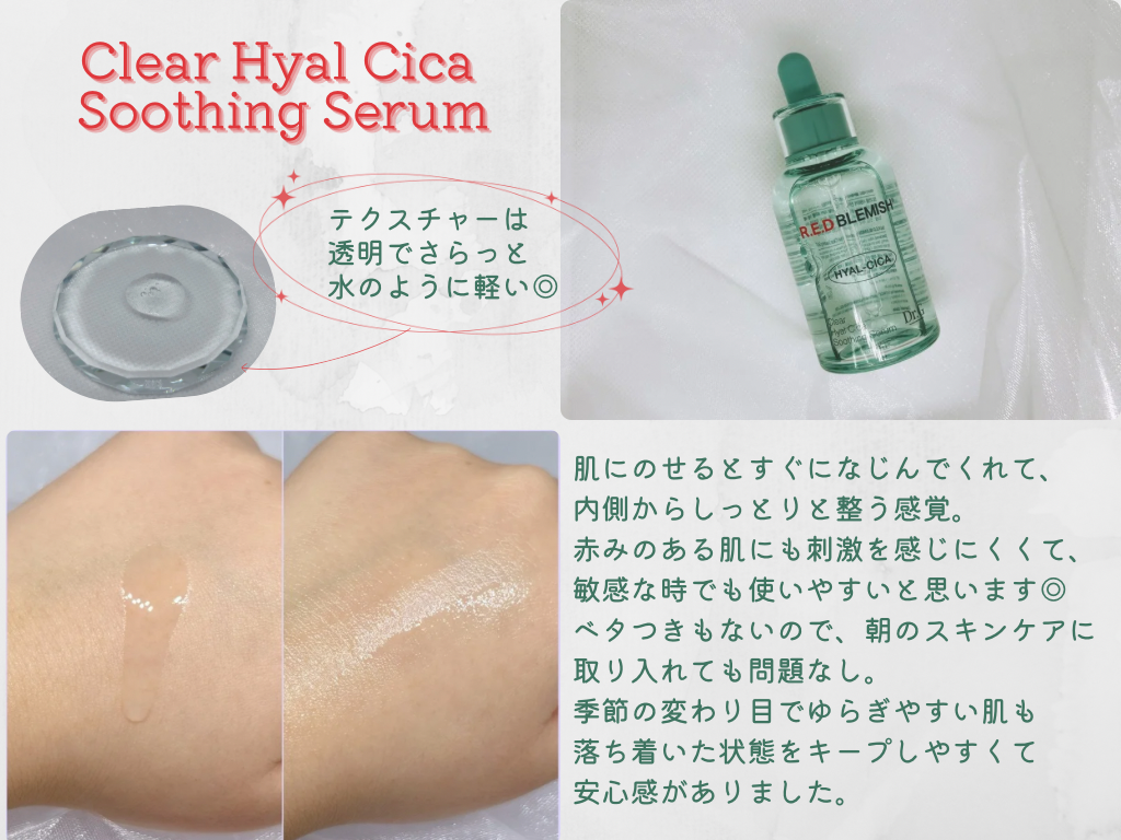 今回は人気のレッドブレミッシュラインから、ヒアルシカ水分セラムとクリアスージングクリームの2アイテムを実際に使用してみました。