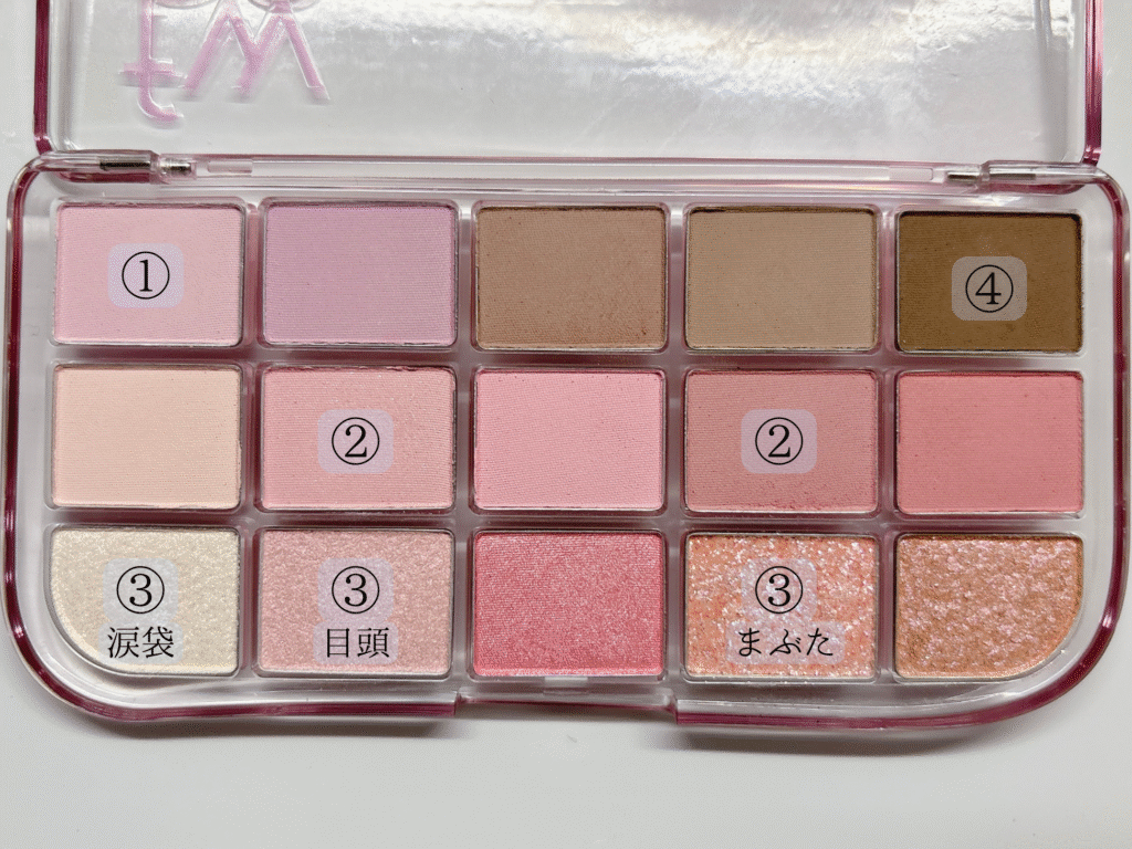 - 上段の淡いピンクでまぶた全体をトーンアップ
